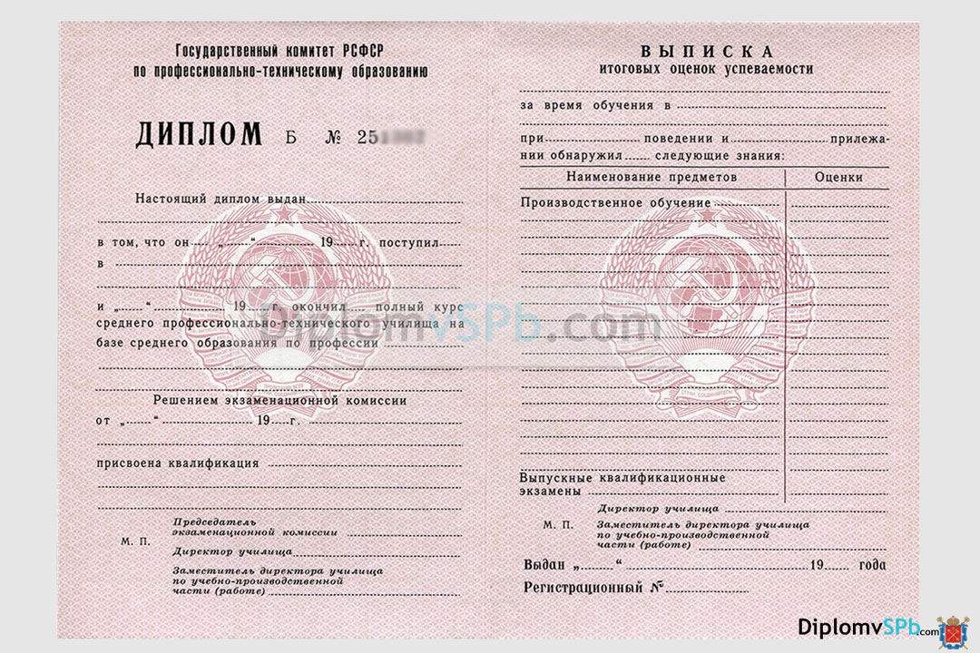 Во времена Советского Союза многие получали техническое профессиональное образование на базе 9 классов. По завершению учебы бывшему студенту выдавали диплом училища. Документ, полученный до 1993 года, до сих пор принимается в качестве подтверждения знаний. Учитывая большой опыт и стаж специалиста, можно рассчитывать на хорошую должность. Отличительная особенность дипломов ПТУ времен СССР в месте выдачи. Сведения дублировались на русском и государственном языке каждой союзной республики. Содержание стандартное: учебное учреждение, наименование курсов, специальность, квалификация, подписи ответственных лиц.