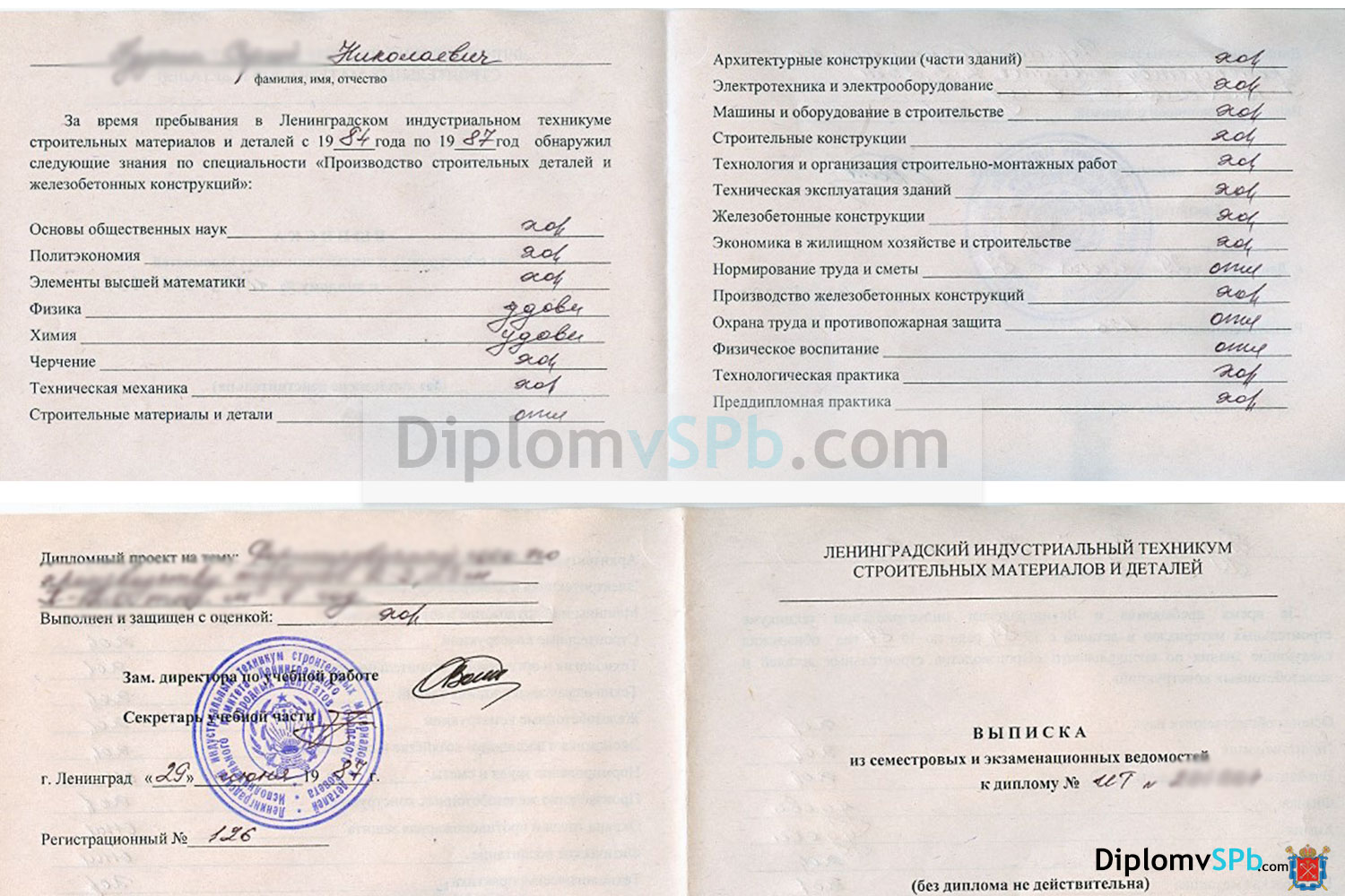 Диплом о среднем образовании периода Советского Союза представляет собой книжку в твердой обложке с данными: ФИО ученика, дата вступления и окончания учебы, наименование курса, специальность, квалификация, регистрационный номер, город, печати и подписи. Выписка из семестровых и экзаменационных ведомостей (приложение) содержит оценки по дисциплинам и ВКР.