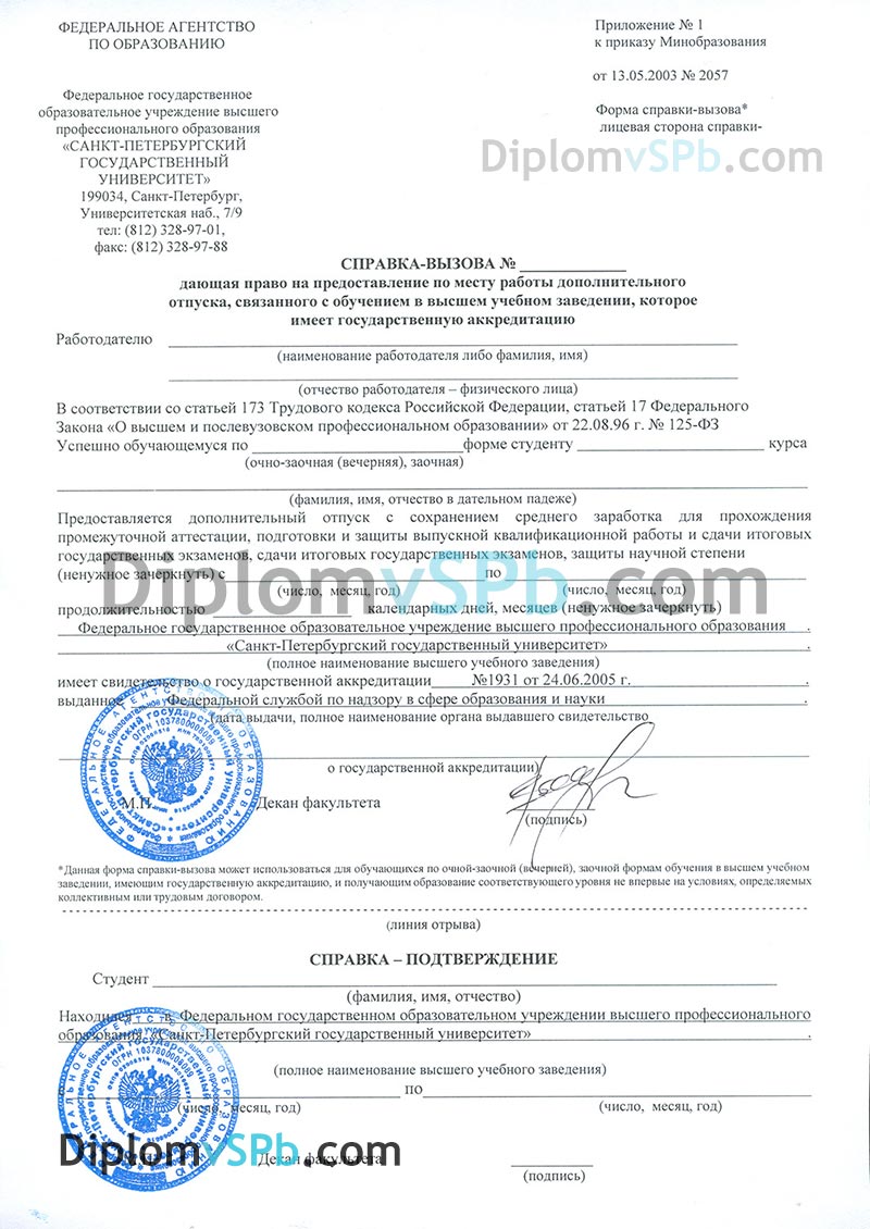 Обращайтесь! Для оформления справки-вызова свяжитесь с нами удобным для Вас способом: по телефону в Санкт-Петербурге 8 (981) 281-09-02, е-мейл hello@diplomvspb.com, или оформив онлайн заказ по кнопке внизу. Доставка по Санкт-Петербургу осуществляется бесплатно и без предоплаты в короткие сроки.
